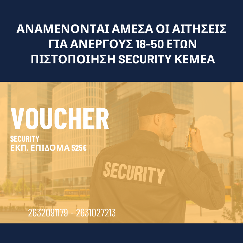 Το πρόγραμμα «Voucher Security» αφορά επιδοτούμενη κατάρτιση 105 ωρών (εξ αποστάσεως) για 5.000 ανέργους (18-50 ετών), με εκπαιδευτικό επίδομα (/ώρα). Στόχος είναι η απόκτηση πιστοποίησης (ΚΕΜΕΑ/ΕΟΠΠΕΠ) και άδειας προσωπικού ιδιωτικής ασφάλειας. Το επίδομα καταβάλλεται συνήθως σε δύο δόσεις ( με την κατάρτιση, με την πιστοποίηση).